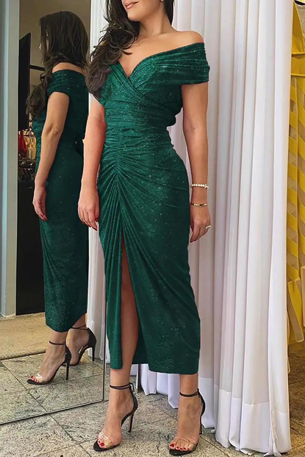 Green/Black Glitter V Neck Off Shoulder Ruched Slit Party Elegant Dress Women Short Sleeve High Qua